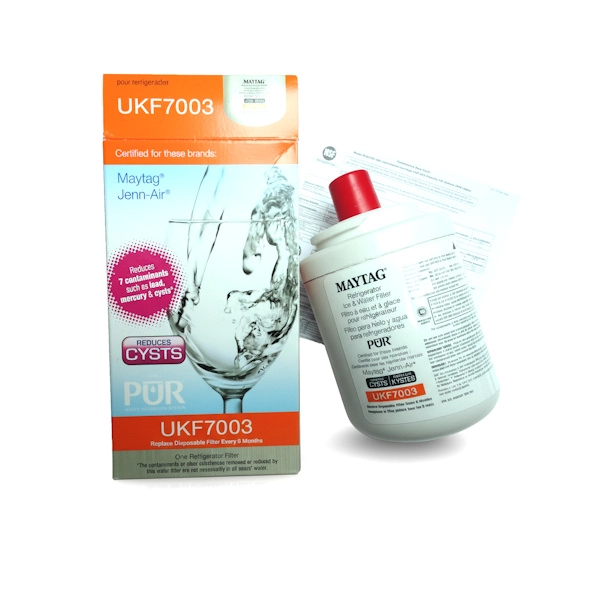 מסנן המים UKF7003AXX הוא הרכיב המקורי המאושר על ידי Maytag לסינון מי השתייה והקרח במקרר.